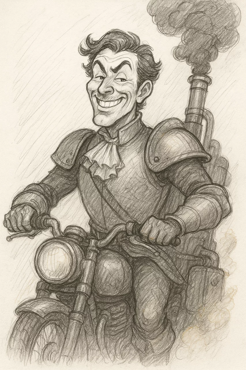 Er reitet ein dampfgetriebenes Motorrad, das mehr ächzt als schnurrt und gelegentlich Bonbonpapier ausstößt – ein Relikt aus einer Schlacht gegen die Süßwarenfraktion.